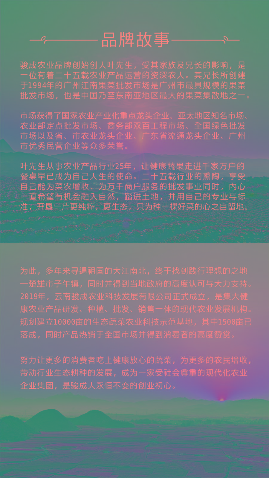 項目介紹 :駿成農(nóng)業(yè)品牌創始創人(rén)葉先生(¥₩£shēng),是(shì)一(yī)位有(yǒu)著(zhe)二十五載農( "πnóng)業(yè)産品運營的(de)資深農(nóng)人(ré ♦•n)。其兄長(cháng)所創建于1994年(niá€↑₽n)的(de)廣州江南(nán)果菜批發市(shì)場(ch↕γ ǎng)是(shì)廣州市(shì)最具規模的(de)果菜批發市(shì)∑δ場(chǎng),也(yě)是(shì)中國(guó)乃至東(dōngα≤€★)南(nán)亞地(dì)區(qū)最大(dà)的(de)果菜集散地(d₹↔↕§ì)之一(yī)。受其家(jiā)族及兄長(cháng✘™)的(de)影(yǐng)響,讓健康蔬果走進千家(jiā)萬戶的(↔ de)餐桌早已成為(wèi)自(zì)己人(rén)生(shēng)的(dε₹®e)使命,葉先生(shēng)于2019年(nián),正式成立雲南(náσ←n)駿成農(nóng)業(yè)科(kē)技(φ>÷jì)發展有(yǒu)限公司,是(shì)集大(dà)健康農(nóng)業(yè)産品研發、種植、批發、銷售σ✔'₹一(yī)體(tǐ)的(de)現(xiàn)代農(nóng)業(↓♠yè)發展機(jī)構。規劃建立10000畝的(de)生(shēng)态蔬菜農(nóng)業(yè→≤←₹)科(kē)技(jì)示範基地(dì),其中1500畝已落成,同時(shí)産品熱(rè)銷于全國(guó)市€₽(shì)場(chǎng)并得(de)到(dào)消費(f♥' ¶èi)者的(de)高(gāo)度贊賞。